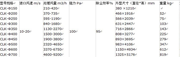 CLK擴(kuò)散式旋風(fēng)除塵器,適用于捕集干燥的非纖維性的顆粒狀粉塵,主要特點(diǎn)是筒身呈圓錐形,因而減少了含塵氣體自筒身中心短路到出口去的可能性,并裝有圓錐形的反射屏,防止兩次氣流將已經(jīng)分離下來的粉塵重新卷起,被上升氣流帶出,因而提高了除塵效率。